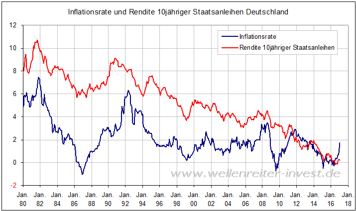 Nicht immer ist der Verlauf von Inflationsrate und Zinsen deckungsgleich, aber die Parallelen sind klar zu erkennen und in der Mehrzahl der Zeiträume vorhanden.