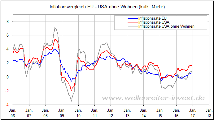 Die Relevanz dieser Übung ergibt sich daraus, dass der von Eurostat verwendete Inflationswarenkorb die Position für selbstgenutztes Wohneigentum gar nicht vorsieht. Im Ergebnis wird die US-Inflationsrate zu hoch ausgewiesen.